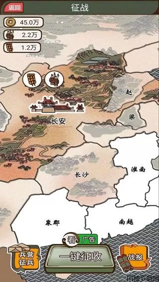 5、大力发展国家的经济,征收民兵更加轻松,壮大国家的军事力量,选择合适的目标出击,完成资源的掠夺,地图的扩展,逐步壮大。