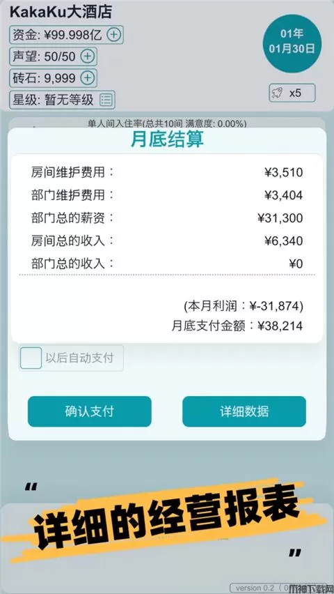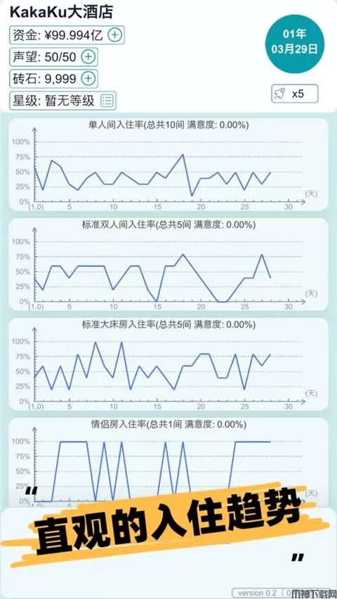 游戏内包含了直观而详细的酒店入住、经营报表,玩家需要根据经营报表去实时调整酒店经营策略!