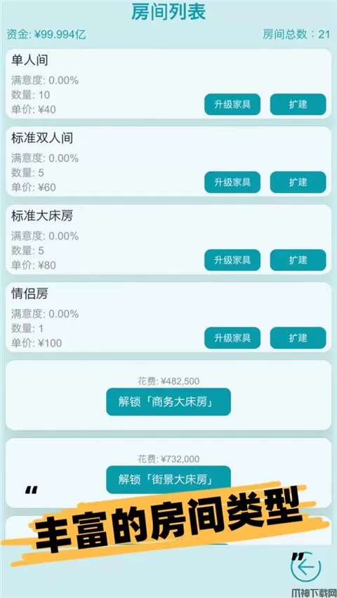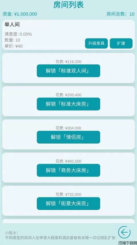 作为酒店经营主题的模拟游戏,建造不同类型的房间可满足不同客户需求。想要解锁更多房间,前期是需要具备充足的资金。期间,你可以通过升级家具等级来吸引更多顾客并提高房间价格。