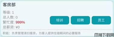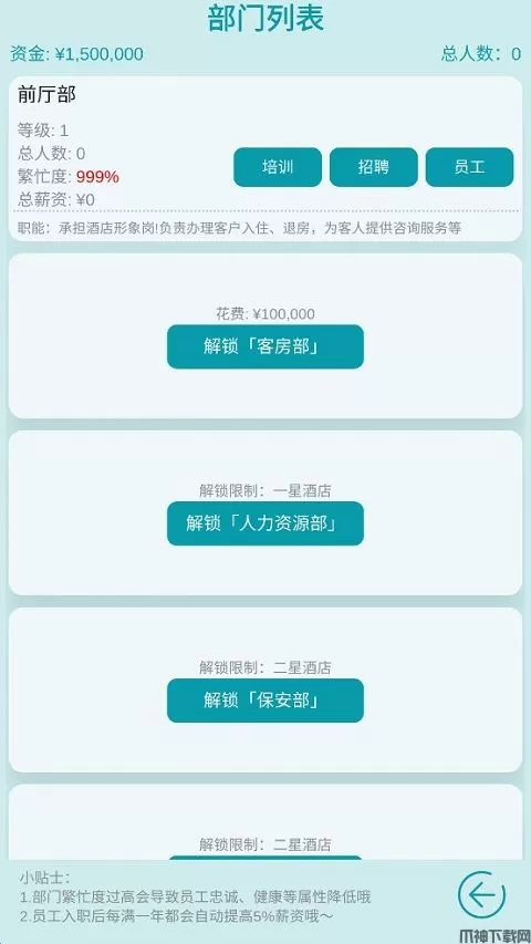 康乐部:为酒店提供健身房、器械健身、球类健身、游泳、桑拿、按摩等服务等等.....每个部门在游戏里面有自己的作用,会触发不同的事件