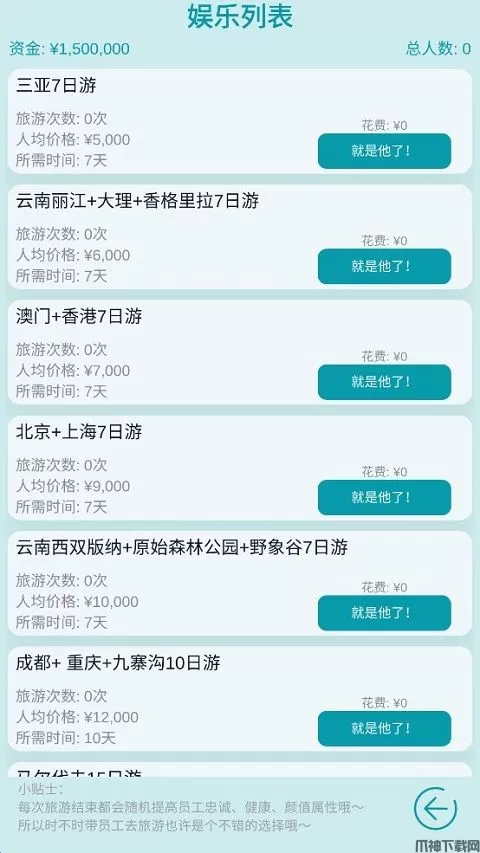 这里的娱乐类似于公司团建活动,每次旅游都能提升员工的各项属性,所以时不时的带员工去旅游是个非常不错的选择。