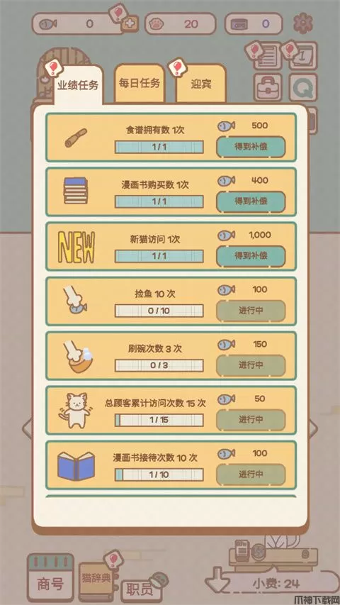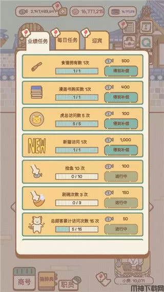 4、这里有业绩任务、每日任务需要玩家完成,还可以招聘迎宾人员招揽顾客;