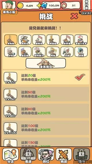 3、进入小吃街,无限升级你的摊位,解锁更多成就和宝石