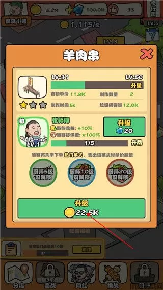 3、当有多余资源时再去升级小摊和厨师的等级。