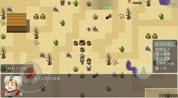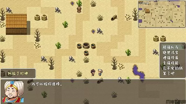 2、然后来到沙漠小镇找灯神开始氪金之路,选择愿望花不完的钱,这里的小怪会掉沙漠泉酿,新手村有个大叔要,会给你一个丹药。