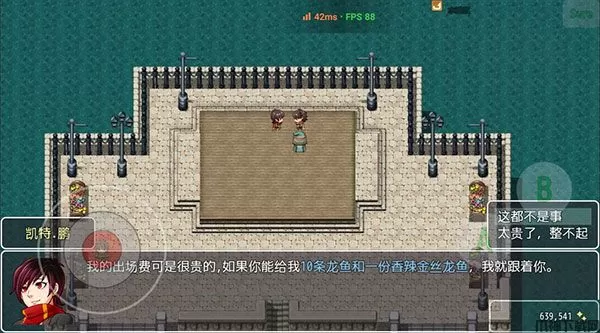4、去到水城去右上方,有个队友需要10个龙鱼和麻辣金丝龙鱼,龙鱼到雪山sl钓,钓出龙鱼就存档,怪物就退游戏重新进,这个很快的,麻辣金丝龙鱼在进城的右边有卖。