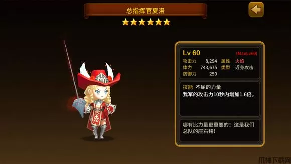 如果说火队的输出点是机器人,那么火队的灵魂人物就是夏洛了,之前的版本作为孔明的替代品,而如今也可以独当一面,由于其特别容易入手(3星起价……),加上6星后属性不俗,成为竞技场、打boss的好手