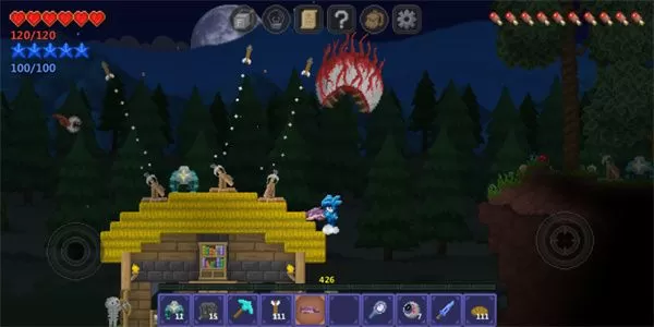 泰拉世界测试服内是会日夜交替的,在早晨,玩家可以到处乱跑也可以建造各种庇护所等等,而当夜幕降临后僵尸、小白以及蜘蛛等等来攻击你,你要么杀死他们,要么就逃走。需要注意的是,在泰拉世界测试服中当你被怪物击败后,你会在10几秒后复活,可是复活后你背包的东西会掉落,所以玩家出去冒险的时候尽量少带一些东西出门,不然被怪物击败后回到解放前那就太可惜啦!还在等什么,有兴趣的小伙伴快来下载游戏体验一番吧!