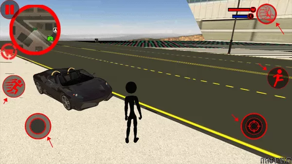 2、现在来介绍左边和右边四个功能按键,左边有一个小人的图标是:一直按住这个按钮,火柴人会加速奔跑;左下方的两个圆表示方向键,用来控制火柴人移动的方向;右边一个抬腿的小人是用来跳跃较高的地方;右下方的瞄准镜图标是用来防御和攻击;而右上方红箭头指向的位置是显示当前的武器。
