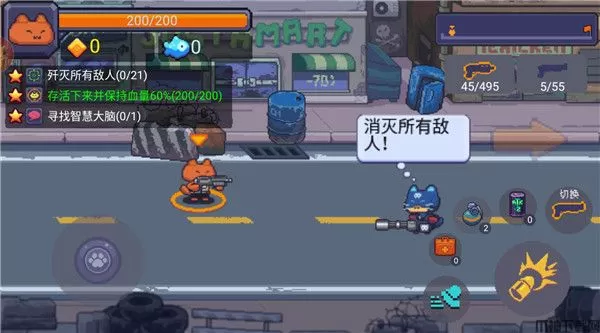 像素射手大战最新版是由深圳市云中燕网络有限公司开发的一款像素动作射击游戏,玩家在游戏中将化身可爱的猫猫,拿起武器消灭敌人,捍卫城市的安全。