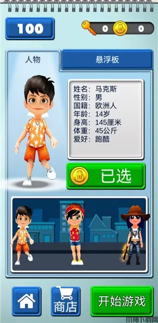 2、我们选择第一个天天跑酷传奇进入,下面是英雄角色和商店;
