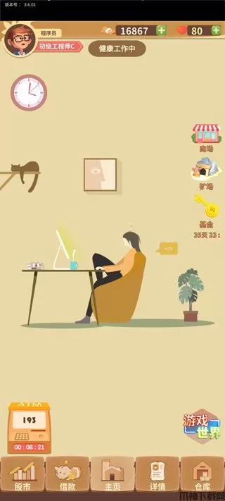 现实世界中,拿到钞票的方式是你的工资,以及各种各样的券和箱子,想要快速拿到钞票怎么办呢?你可以点击左上角人物的职级,如,上图中的初级工程师C,加班还可以加速升职的进度,但是有一点,大学生的工资是随着职级上升而下降的,请谨慎,加班需要消耗健康,其中如果你的健康值在80级以上,那么你的工作效率为100%,健康低于80时工作效率会下降,到健康20时,工作效率为0,你永远没工资可拿,因此在任何时候,除非马上要嗑药,请保证你的健康值在80。点击游戏右上方的健康值加号可以进入药店,在你健康低于80时,界面右侧会出现救护车也能让你进入药店。