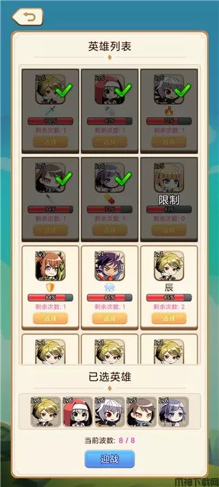 总的来说就是得人多,每个人有三次出场机会,打的时候上1-2个主力,2-3个替补,不要一窝蜂先把主力放上去,前几关简单,上一级的角色搭配一些角色就可以了,后面搭配着上,计算好后两波上主力全队。