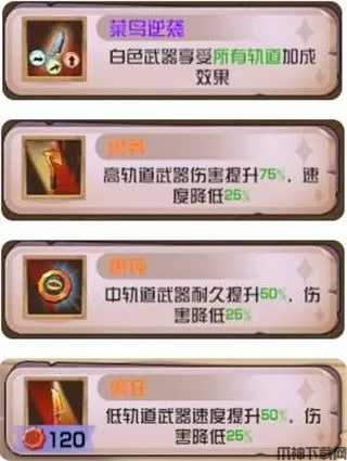 特点:版本毒瘤,过于全面的一套搭配。依靠【菜鸟逆袭】的效果让白色武器吃到所有轨道的加成效果,可以使白色武器个个成为超人。当然,还是优先提升速度和耐久,其次才是攻击力。前中期如果有【菜鸟逆袭】可以考虑玩,如果没有避免硬玩,容易暴毙。现版本似乎只有事件里才会出现【菜鸟逆袭】,所以成型的难度比之前高了一点,但效果不变,还是强。