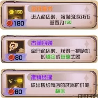 思路:前期可以考虑拿个【古董窃贼】,一但偷到橙色武器,直接赚翻。【金钱魔术】可遇不可求,有的话见商店就去。如果战斗压力不大,可以考虑通过传承神殿养一把4镀金技能的武器,现版本事件里也能镀金,4镀金技能难度下降,后期复制几把4镀金的武器,卖了就能搬空商店。