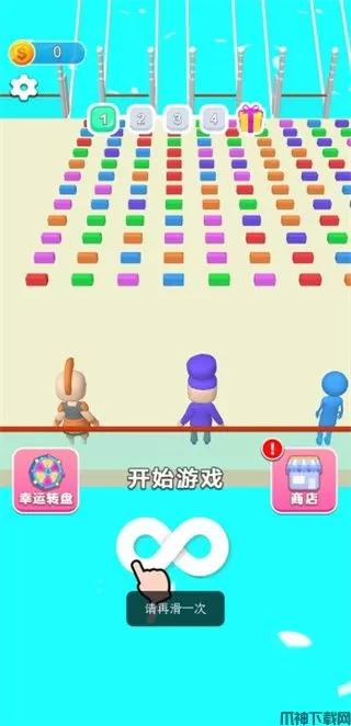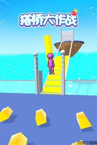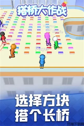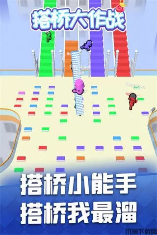 搭桥大作战(Bridge Race)是一款休闲益智类手游,玩家在游戏中需要拾取地上的砖块,收集后背在背上然后跑到楼梯进行搭建,收集的每一块砖块都是玩家得以进入下一关的关键,不同皮肤对应不同颜色的砖块,只有将楼梯铺满自己颜色的砖块后,玩家可以顺利的走上楼梯进入下一关,注意在撞击到比自己背的砖块多的玩家时,将会跌倒,同时背上的砖块归零需要重新进行收集,所以如果你是喜欢刺激玩法的玩家,你可以在兼顾自己楼梯的同时,在对手的楼梯放上自己颜色的砖块,这样能拖延其他玩家的时间,为自己获得胜利创造机会,需要不断的其他与玩家进行对抗,谁利用最少的搭建时机搭出更多的桥梁路线,那么就可以更快地到达终点,并取得游戏的胜利。