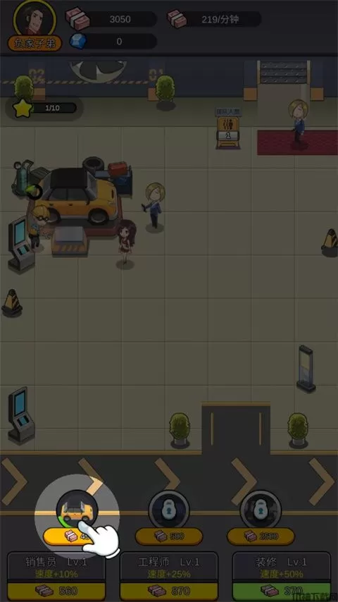 5、资金已经到位,汽车工厂需要升级。我们先升级紧凑轿车,客人太多了,销售员招待不过来了,快点点击升级加速,升级工程师,可以加速汽车的制造。装修汽车工厂会带来更多的客人。
