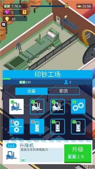 3、选择印钞工场,这里可以购买叉车等设备,然后让技术工进行操作,有一定钞票之后可以进行升级;