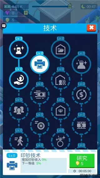 4、点击灯泡形式的按钮,在这里你可以进行研究,增加收入提高等级。