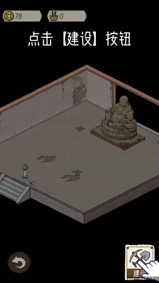 2、现在当务之急是要修复天王殿内部,点击场景进入天王殿内。之后面对破烂不堪的天王殿内部,先摆上一个蒲团
