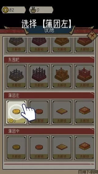 在这里选择蒲团,另外玩家同时能在这里发现许多装饰,如围栏、佛像、窗户、烛台、立灯、蒲团等等