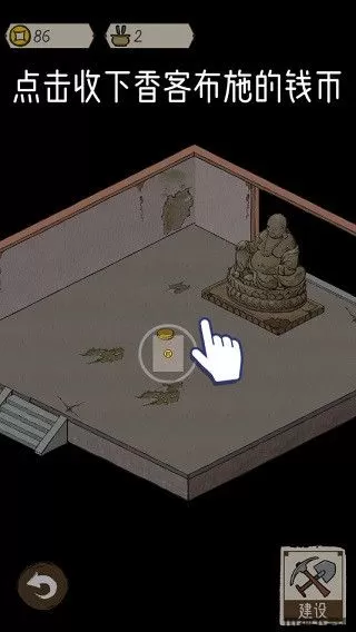 4、回到天王殿内部,此刻将会有香客前来拜佛,在香客离开后点击收下香客布施的钱币即可为寺庙增添香火钱,这些对于寺庙的重修有着至关重要的作用