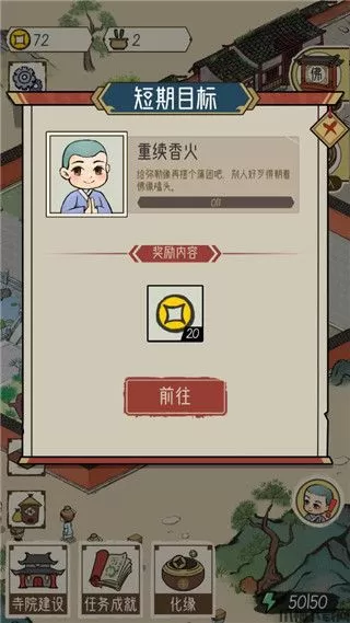5、如果玩家当下不清楚该干嘛就对点击打开【短期目标】,通过里面的任务引导,完成寺庙的重建,并持续发展