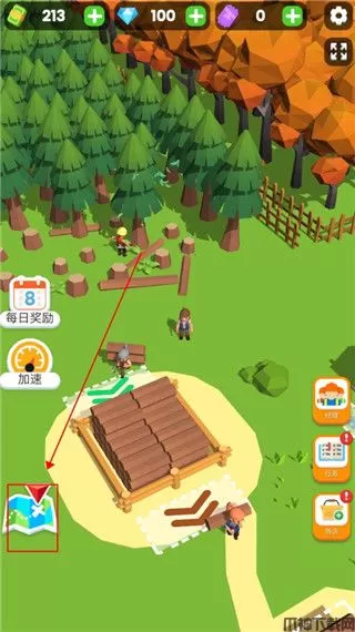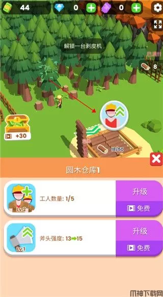 4、一个人砍树终究效率还是太低了,我们可以点击此处,招募一个工人一起帮忙,后续还可以升级工人的效率