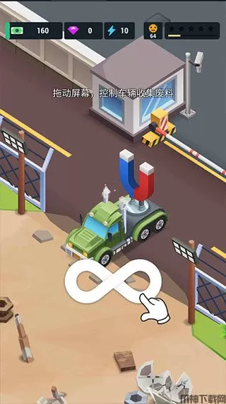2、玩家通过拖动屏幕,控制车辆收集废料;