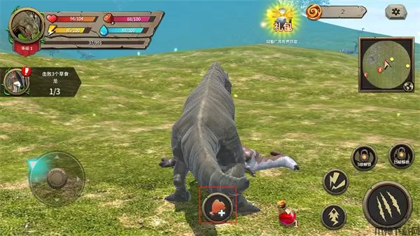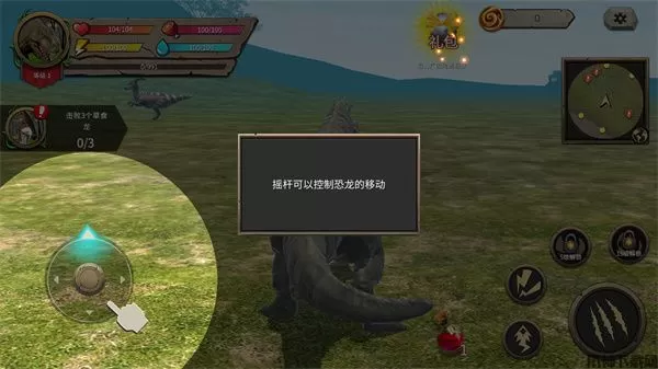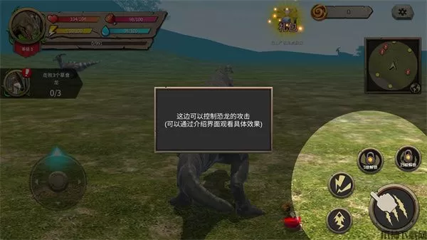 游戏的操作十分的简单,玩家只需要通过左下角的摇杆来控制恐龙的移动,通过右下角的按键来控制恐龙进行攻击,需要重要的是,玩家需要时刻注意恐龙的血量、饥饿、饥渴等数值,玩家可以通过捕食其他动物回复血量和饥饿,可以在小河中饮水来回复自己的饥渴来保证自己的生存,当血量为0时,恐龙将会死亡。