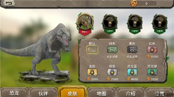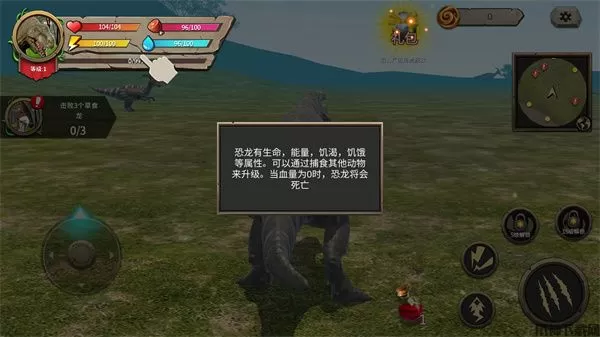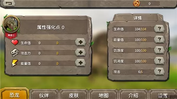 4、恐龙有生命、能量、饥渴和饥饿等属性,玩家可以通过捕食其他动物来升级,当血量为0时,恐龙将会死亡;