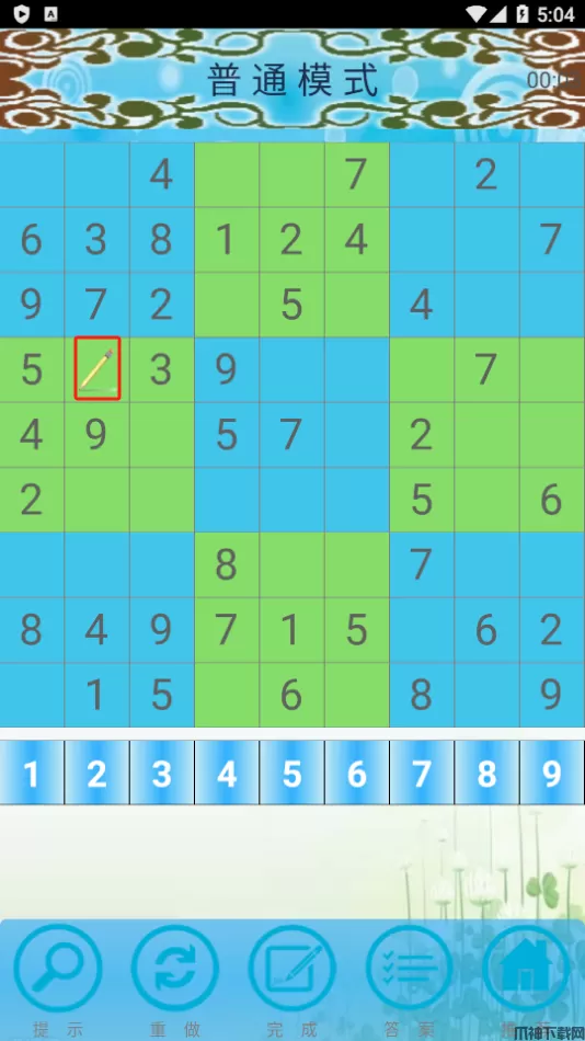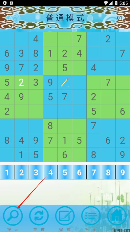 3、如果玩家不太确定格子里应该填什么数字,可以直接点击左下角的【提示】按钮,游戏会自动生成正确数字填入铅笔处。