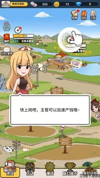 5、如图所示,在每个乡村企业的上面都有一个“+”,点击“+”可以安排主管上岗哦,上岗后的企业效率将大大增强。