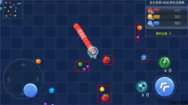 2、左边的遥杆是控制贪吃蛇的移动方向,右边有技能是用来加速的
