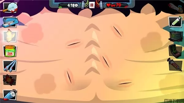 1、操作上游戏全屏滑动加功能按键相结合的操作方式,利用各种工具帮患者拔出玻璃,钉上伤口,涂抹药膏等等