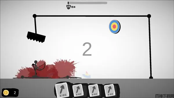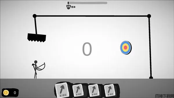 1、游戏简洁到连开始界面都没有,就直接开始游戏了,我们控制的火柴人手里拿着弓箭,需要我们来控制弓箭射出的角度来命中靶子。