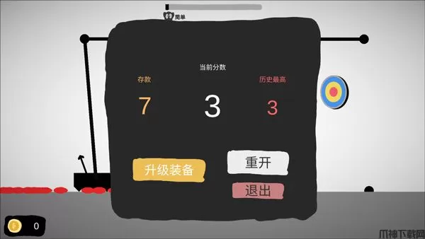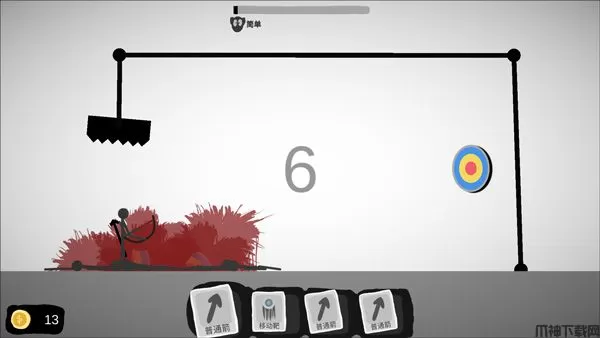 2、如果偏了,那恭喜你重开吧,射偏了的话呢就会碰到靶子后面的绳子,绳子连接着一个满身是刺的铁块,绳子一断火柴人就gg了。