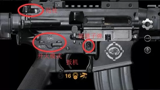 2、步枪:跟冲锋枪的原理基本一致。不过注意开火模式是把指针调到要选择的模式的对面,才是选择该模式,如下图指针在AUTO的对面,表示现在是自动连发模式。