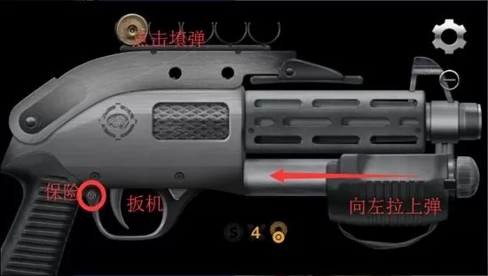 5、霰弹枪:霰弹枪后面装填时,只能先装填4个子弹,拉枪栓上弹后才能装最后一个子弹,另外点击后面的按钮把上面放下来当枪托的时候是无限子弹模式的。
