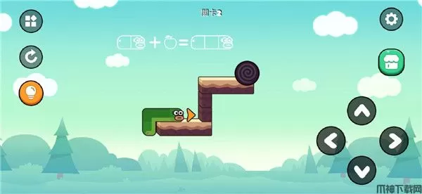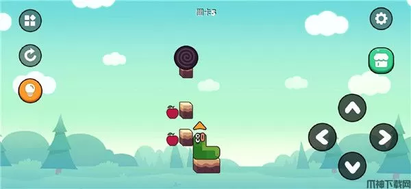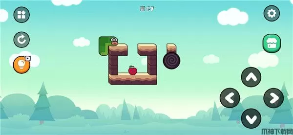 这一关开始有点难度了,先向右,但是不要看到苹果就直接吃,而是先来到右边,然后向上拐,再向左吃到苹果,从左边绕出来,爬上去,从上方抵达终点;