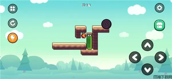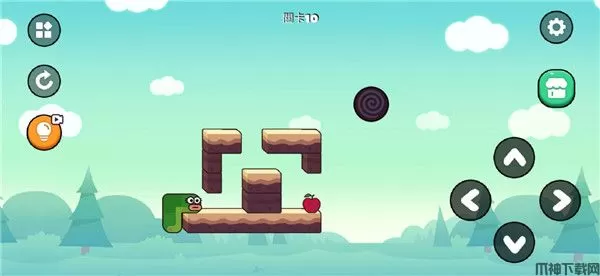 往前移动,到达边缘时往下走。先不吃苹果,先往左边移动,在里面跳转方向出来后再吃苹果。吃掉苹果后,往黑洞那里移动,就能完成关卡。