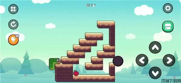 这一关先来到中间的缺口,向下,但是同样不能直接吃苹果,而是先从右侧绕下去,转一圈吃到苹果再绕上来,然后从最右边绕下去,抵达终点;
