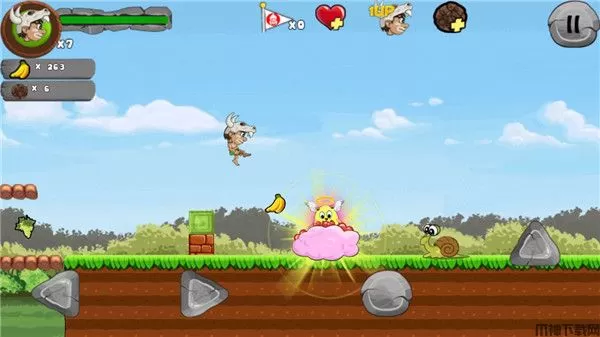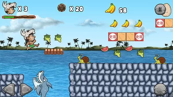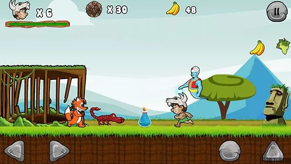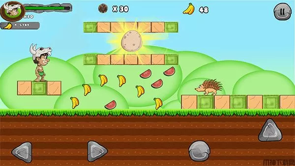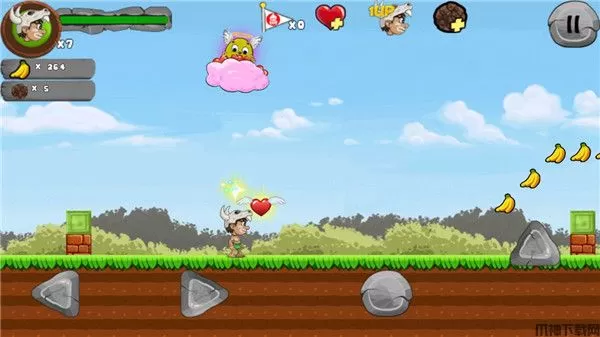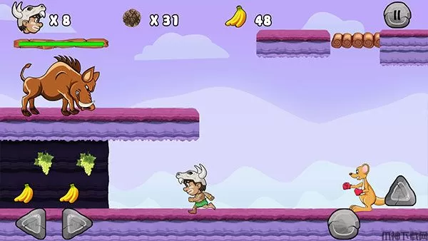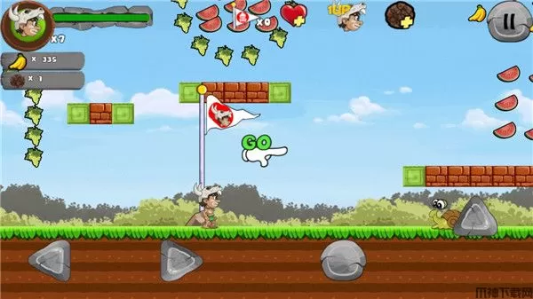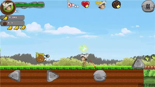 一路上玩家可以收取各种丛林中的水果,提升自己的分数,还有与众不同的特殊道具,玩家通过拾取这些道具,将会获得特殊的能力加成,有可能会是武器道具,又或者是生命力加一,非常的有意思。