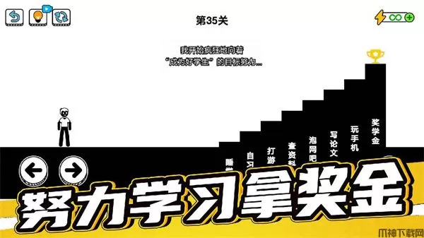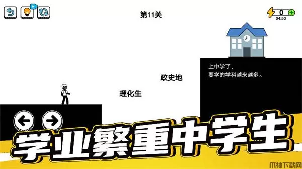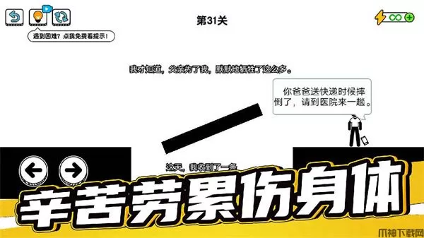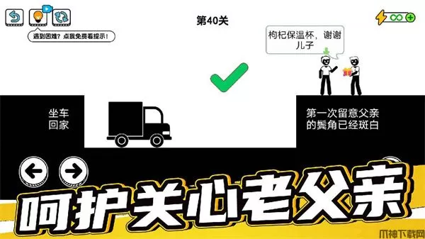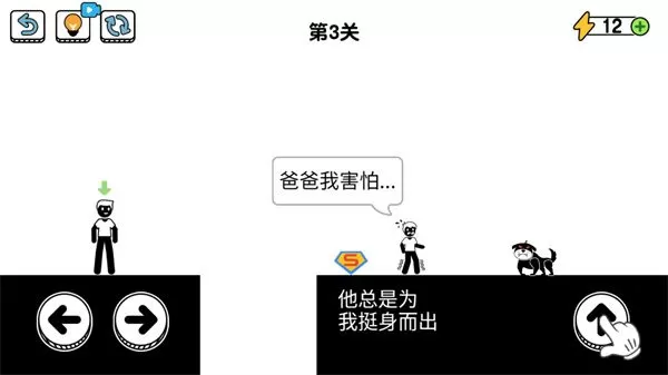 游戏里面还包含各种各样的脑洞大开的玩法,游戏中玩家轮流扮演主角(我)、父亲二人,通过每个关卡当中的各种考验,顺利的达到目标完成通关。玩法也十分的简单,玩家只需要通过操作角色左右移动,上下跳跃等即可,但是游戏中具有各种脑洞玩法,所以玩家需要通过点击、拖拽界面中的隐藏元素等,过关方式往往出乎意料。