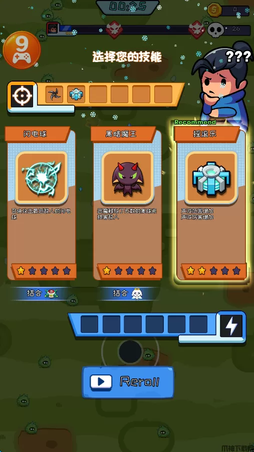 2、消灭怪物后,掉落水晶,通过捡拾足够的数量,来提升自己的等级,随后可以选择技能,选择“摇滚乐”。