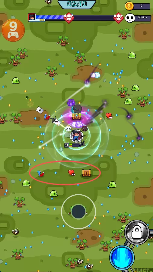 8、可以看到周围的小怪就无法靠近角色,只需要在原地不动一段时间,随后就可以拾取水晶即可。