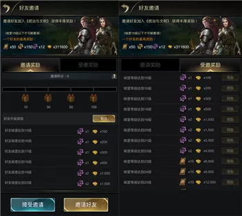 邀请好友进行绑定关系,可获巨额金币和大量英雄碎片,是的,你没听错,一个账号可邀请10个好友,如果你的一个好友升到30级堡,将可以领取到31万金币,和最多50个高级招募卡和高达150个S级万能碎片