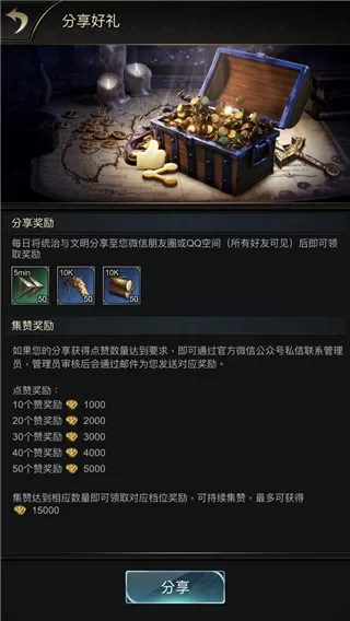 按要求分享可获得丰厚奖励,邀请你的好友可以一同帮助、成长以及抵御其他联盟的攻击、或者相反、你可以与你的好友一起掠夺其他联盟的资源
