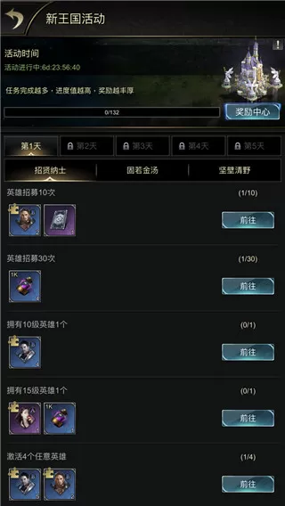 《统治与文明》新王国活动每天会开放新的任务页,完成对应的任务,可获得非常丰厚的任务奖励;在活动持续7天中根据你完成任务的多少,可以领取期限至永久的城堡外观。活动结束时有一个特别的宝箱奖励,奖励档位的划分是根据玩家完成任务数量的情况来划分。最高档的奖励包括2万金币,50小时的加速以及大量资源和英雄培养道具等道具,可以很好的帮助前期的发展,领先他人一步。新王国活动完成任务数达到130项,还可直接获得永久城堡外观——云端城