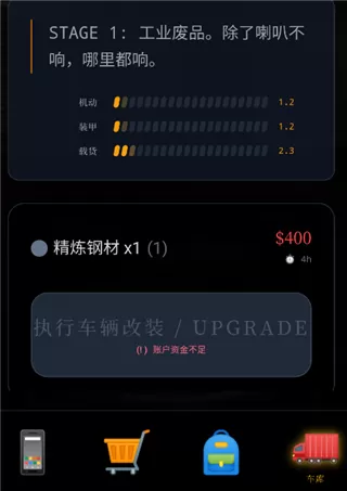 末世我有一辆房车游戏真正的生存核心,是那辆陪你穿越废土的房车。车辆等级越高,机动性、装甲防护与载货能力越强,你需要通过金钱与特定材料不断升级改装,让它从普通代步工具进化为移动堡垒。与此同时,车库空间管理也极具策略性,不同物资占用不同格子,支持旋转摆放,你要像玩俄罗斯方块一样精细规划有限空间,在紧张与理性之间找到最优解,才能在末世浪潮中稳步推进,笑到最后。